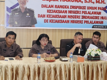 Dalam Inspeksi Umum kali ini, pemeriksaan dilakukan bersama dengan Kejaksaan Negeri Indragiri Hulu yang bertempat di Kantor Kejaksaan Negeri Pelaalwan. Tim Inspeksi Umum Kejaksaan Agung Republik Indonesia melakukan pengecekan terhadap kegiatan-kegiatan yang telah dilakukan serta kelengkapan administrasi dari setiap bidang yang ada pada Kejaksaan Negeri Pelalawan dan Kejaksaan Negeri Indragiri Hulu. Adapun Tim Inspeksi terdiri dari :