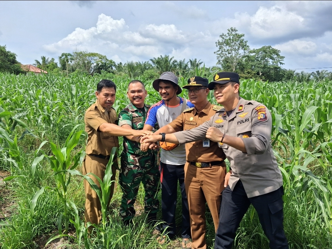Kuantan Singingi – Camat Singingi Hilir Andhi Samsul, S.Kep Bersama Kapolsek Singingi Hilir Iptu Alferdo Krisnata Kaban, SH. dan Danramil Ardiyasman Kunjungi Kebun jagung Pipil Milik Bumdes Kemilau Sungai Ome di Desa Koto Baru Kecamatan Singingi Hilir, kabupaten Kuantan Singingi. Kini menunjukkan perkembangan yang menggembirakan, Senin, (23/06/2025).
