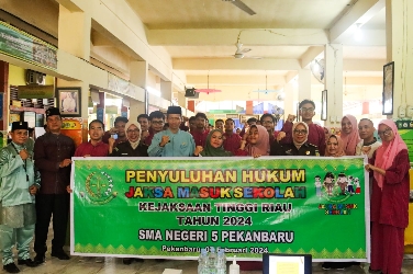 Liputan106.com | Pekanbaru – Rabu Tanggal 07 Februari 2024 sekira pukul 10.00 Wib, Bertempat di SMA Negeri 5 Pekanbaru, Kejaksaan Tinggi Riau melalui Tim Penerangan Hukum (Penkum) Bidang Intelijen pada Kejaksaan Tinggi Riau memberikan Penyuluhan Hukum Program Jaksa Masuk Sekolah (JMS) pada siswa/i SMA Negeri 5 Pekanbaru.