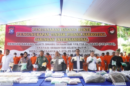 Dalam kegiatan pemusnahan barang bukti narkotika yang digelar hari ini, Polda Riau memusnahkan Barang Bukti Narkoba terdiri dari sabu seberat 119,7 kg, heroin 3,87 kg, ekstasi sebanyak 43.674 butir, dan ganja seberat 16 kg.