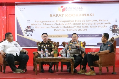 Liputan106.com | SIAK,-Kapolres Siak AKBP Asep Sujarwadi, SIK, MSI jadi narasumber dalam Rapat Koordinasi Pengawasan Kampenye Rapat Umum,Iklan media massa cetak dan iklan Media elektronik bersama sentra Gakkumdu Kabupaten Siak pada pemilu 2024, ( 06/02/24)